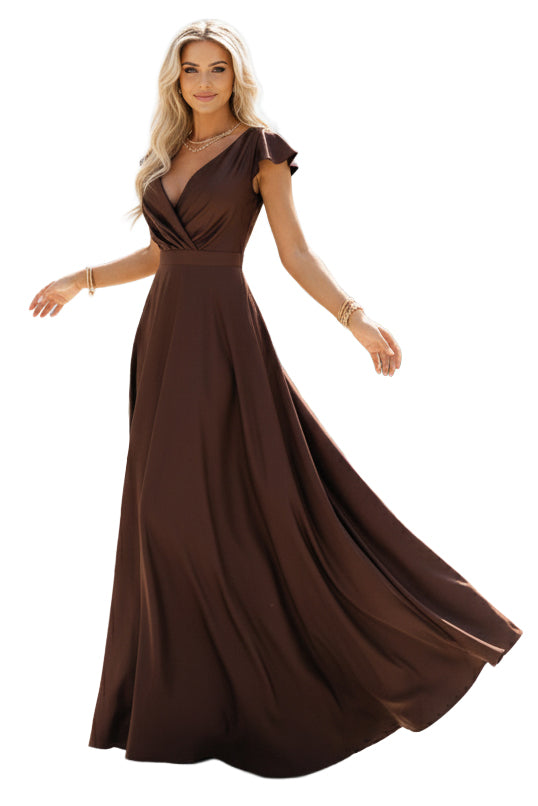 Glänzendes Satin-Maxikleid der Marke Numoco in edlem Schokoladenbraun. Feminine Linie mit Wickelausschnitt; zarten Flügelärmeln und Beinschlitz; die die Silhouette wunderschön formt und beim Tanzen perfekt funktioniert. Made in EU - EU Produktion.